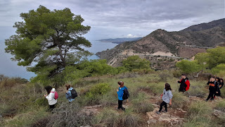 Regresamos al sendero que traíamos, que nos llevará hasta la playa nudista de Cantarriján, que vamos divisando desde el camino. El sendero asciende entre un pinar con un sotobosque lleno de jara, romero, lentisco, esparto, palmitos, salvia y encontramos algunos algarrobos, acebuches y cornicabras; una frondosidad espectacular en su riqueza y diversidad. A nuestro paso es posible que nos salgan ejemplares de cabra montesa, frecuente en estos cortados.