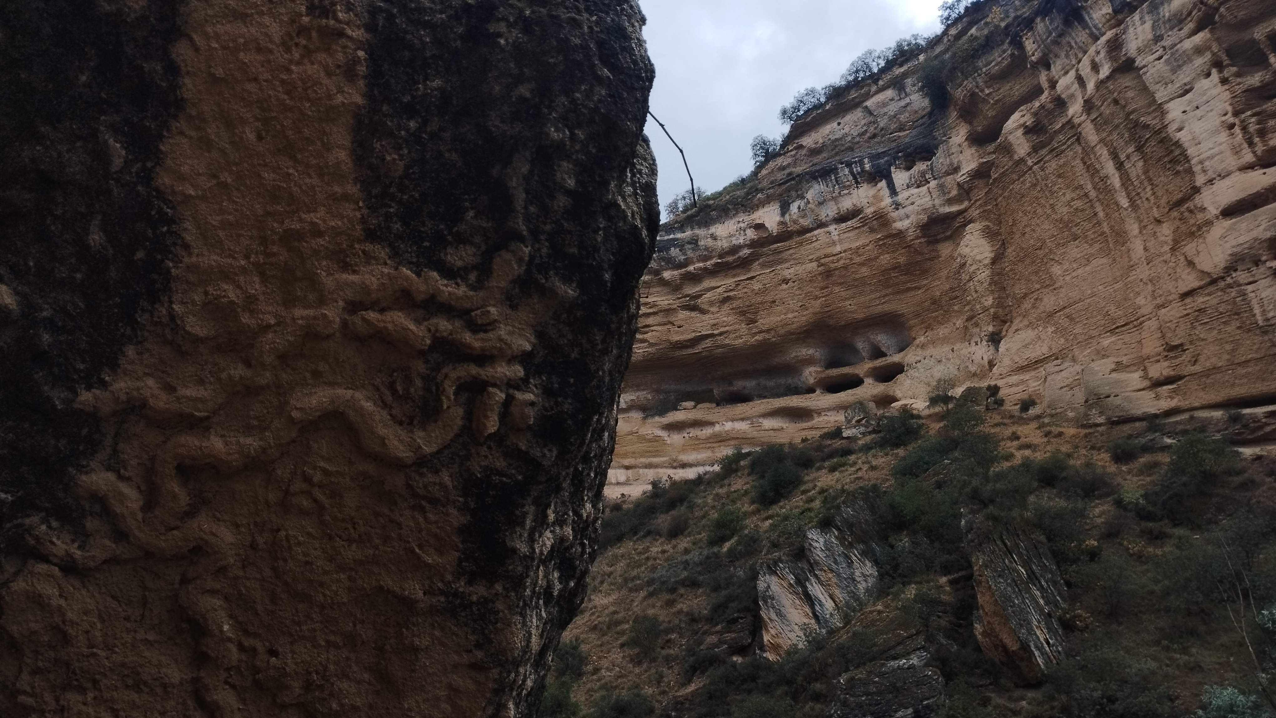 De vez en cuando alzamos la vista para observar las repisas de arenisca, a alturas de diez metros sobre el cauce, en las que se encontraron restos de asentamientos de los habitantes del neolítico, entre ellos uno de los tesoros del Museo Arqueológico Nacional, la Olla de Cacín, el vestigio de cerámica radial mejor conservado de Europa meridional.